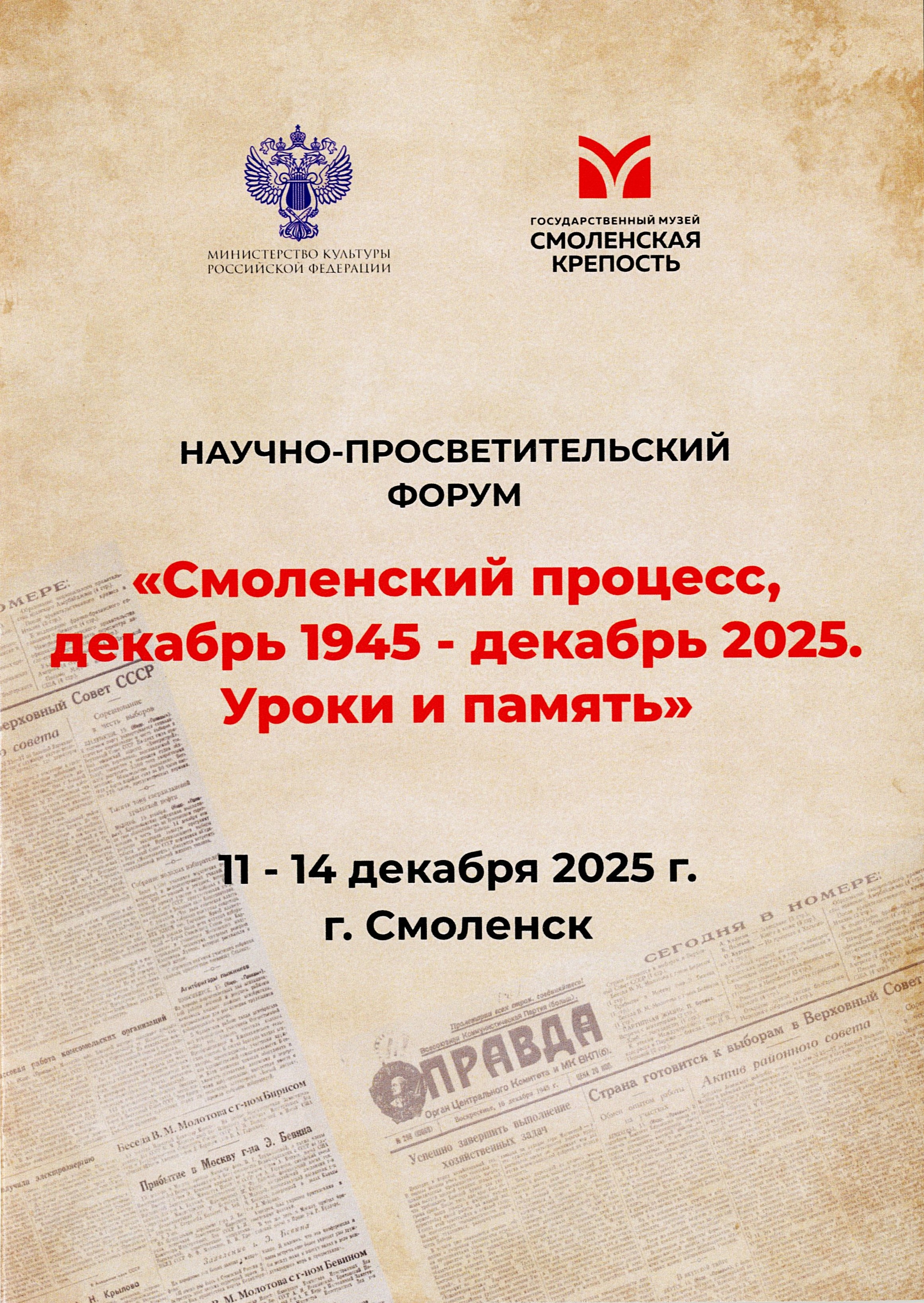 В Государственном музее «Смоленская крепость» состоялся научно-просветительский форум «Смоленский процесс, декабрь 1945 – декабрь 2025. Уроки и память», посвященный 80-летию Смоленского судебного процесса над нацистскими преступниками 15-19 декабря 1945 года. В форуме приняли участие представители Следственного комитета и областного суда, работники архивов, музеев, библиотек из Смоленска, Рославля, Гагарина, Екимовичей, Москвы, Республики Крым.