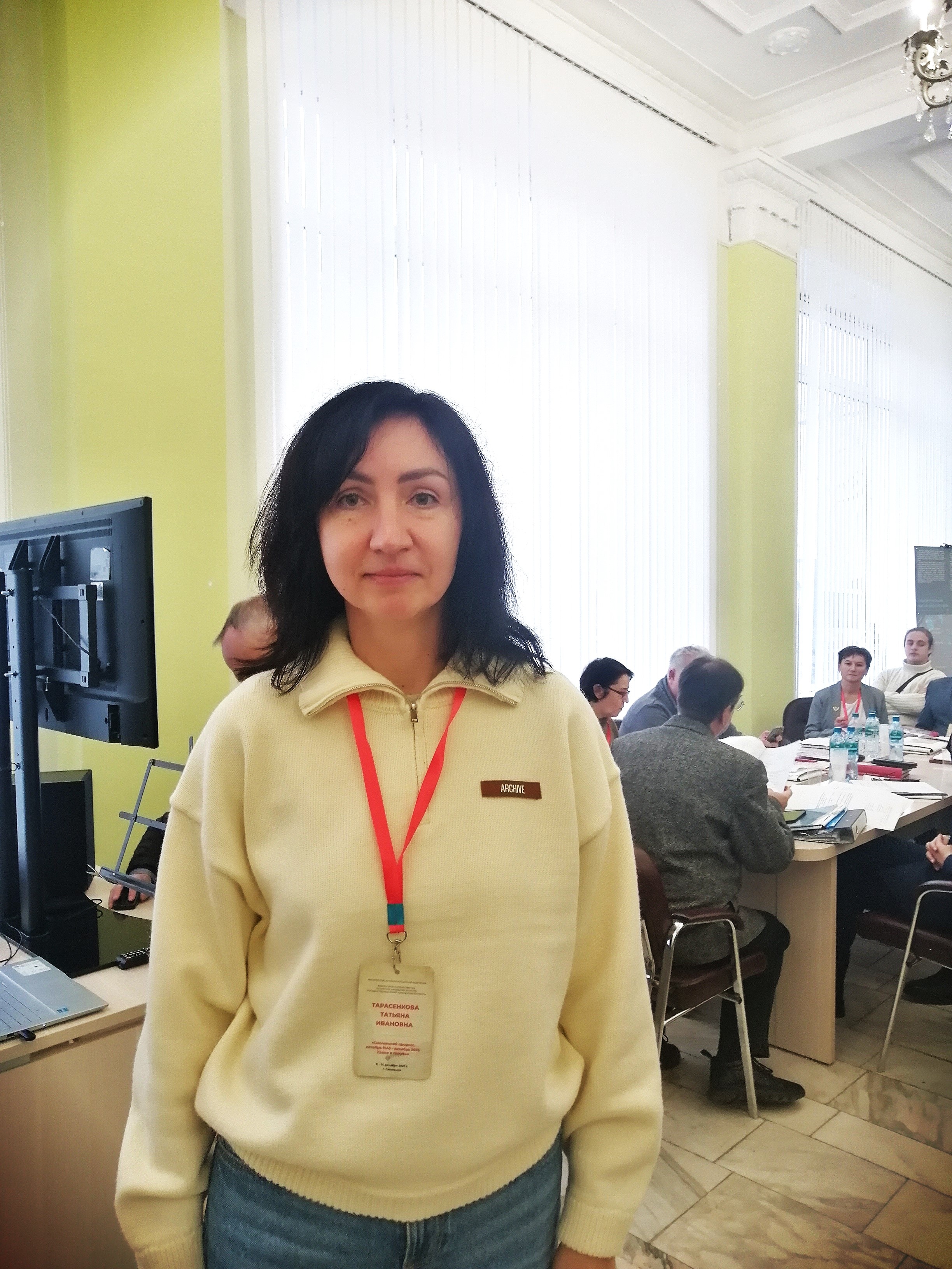Сотрудник архива Татьяна Тарасенкова выступила с докладом «Из истории подготовки Смоленского процесса» и рассказала о документах Чрезвычайной государственной комиссии и следственных материалах, которые использовались при подготовке процесса.